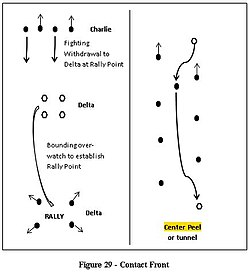 The peeling maneuver is a rapid break-contact tactic that involves continuous fallback movement from the element. In the element, the front-most unit fires at the threat to suppress them and then moves backward rapidly past the next man behind him. The man behind him is now the new front-most unit and takes over suppression duties until the “peeling” man has repositioned. Then he will retreat backward as the man behind him takes over. This process is repeated until the element has disengaged from the enemy.