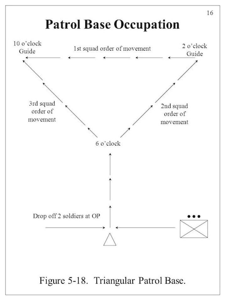 Once the element has entered the PB area, a full 360 degree security perimeter must be created. From here there are two common shapes used. The first is a cigar shape for PBs that consist of squad sized patrols, and the other is a triangular PB for platoon sized patrols. Note that for both options, a Listening Post or Observation Post (see my article on OPs) may be attached.