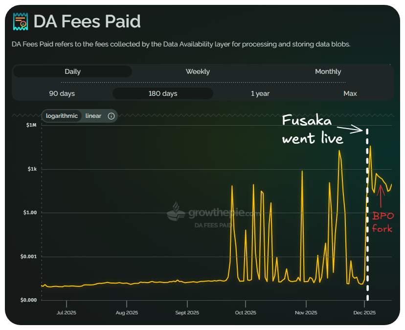 We are beginning to see the impacts of a higher blob floor price, this will compound with further BPO (Blob Parameter Only) forks. It will take some time to see the full economic impact of Fusaka but things look to be moving in the right direction.
