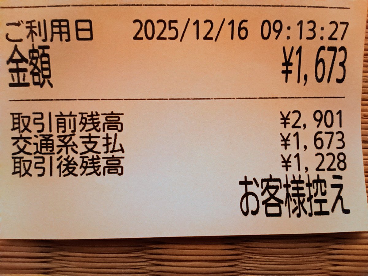 レシートの一番下を見ると、2,901円から1,673円支払って残高が1,228円になったことになっている。これだけ見ると、私が1200円くらい余計に払わされたように見える。 Image