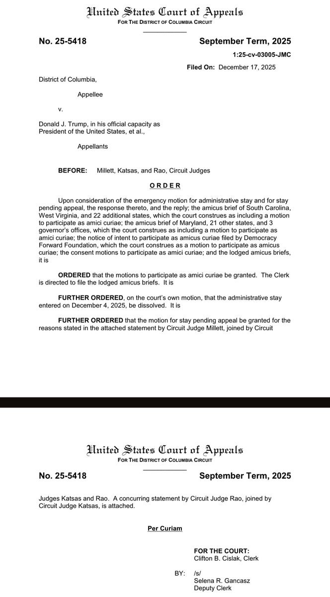 Can President Trump deploy the National Guard in DC? Unanimous opinion by Judge Miller (Obama) joined by Judges Katsas and Rao (Trump) says "Yes." Huge win for the President. Judge Rao writes separately to question whether DC can sue at all. She thinks probably not.
