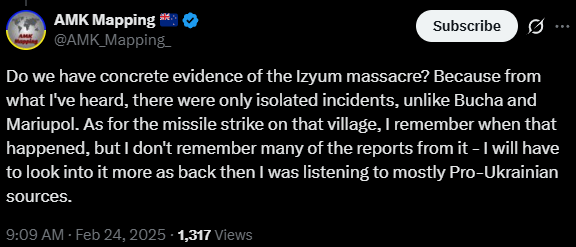 Arlo's pro-Russian talking points continue, like denying massacres such as at Izium.
