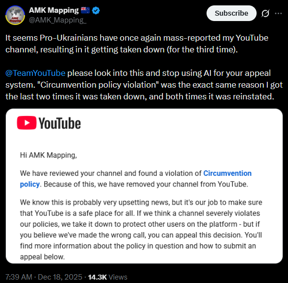 Of course, when his YouTube channel got taken down it was the work of mysterious "Pro-Ukrainians". No evidence given.