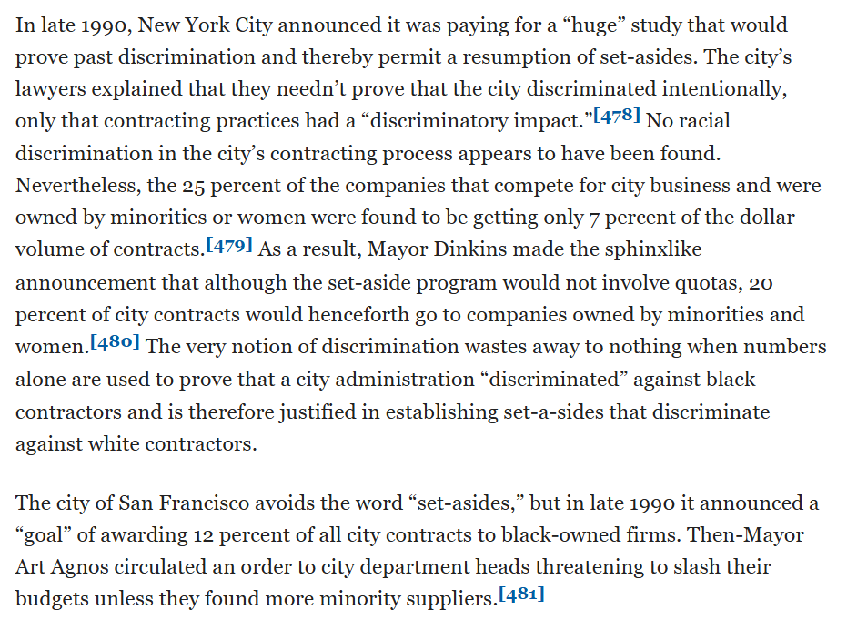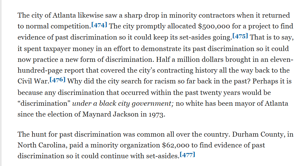Atlanta (in 1989 under a black government for 20 years) spent half a million dollars on a project to find past discrimination so it could keep these set-asides going. NY and SF similar.