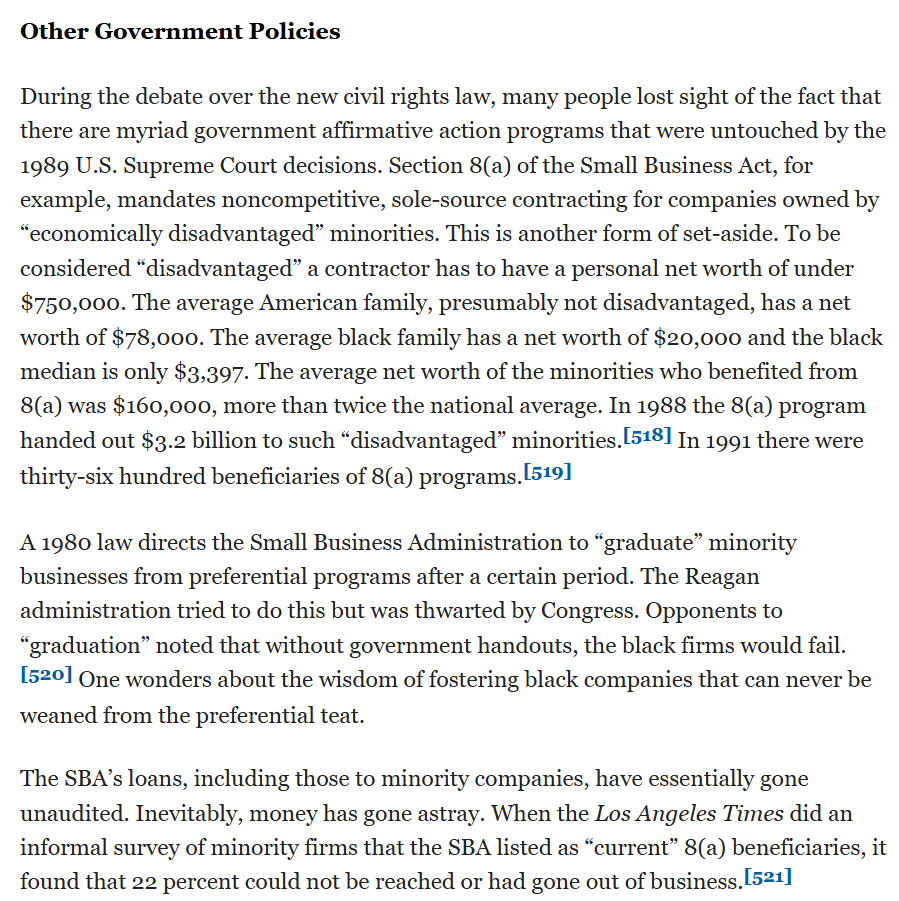 More on the long history of affirmative action/DEI in the US. These excerpts are from Chapter 5 of the 1992 book "Paved With Good Intentions," and cover affirmative action outside of education and employment. The 1978 Community Reinvestment Act forced banks into giving subsidized loans to nonwhites.