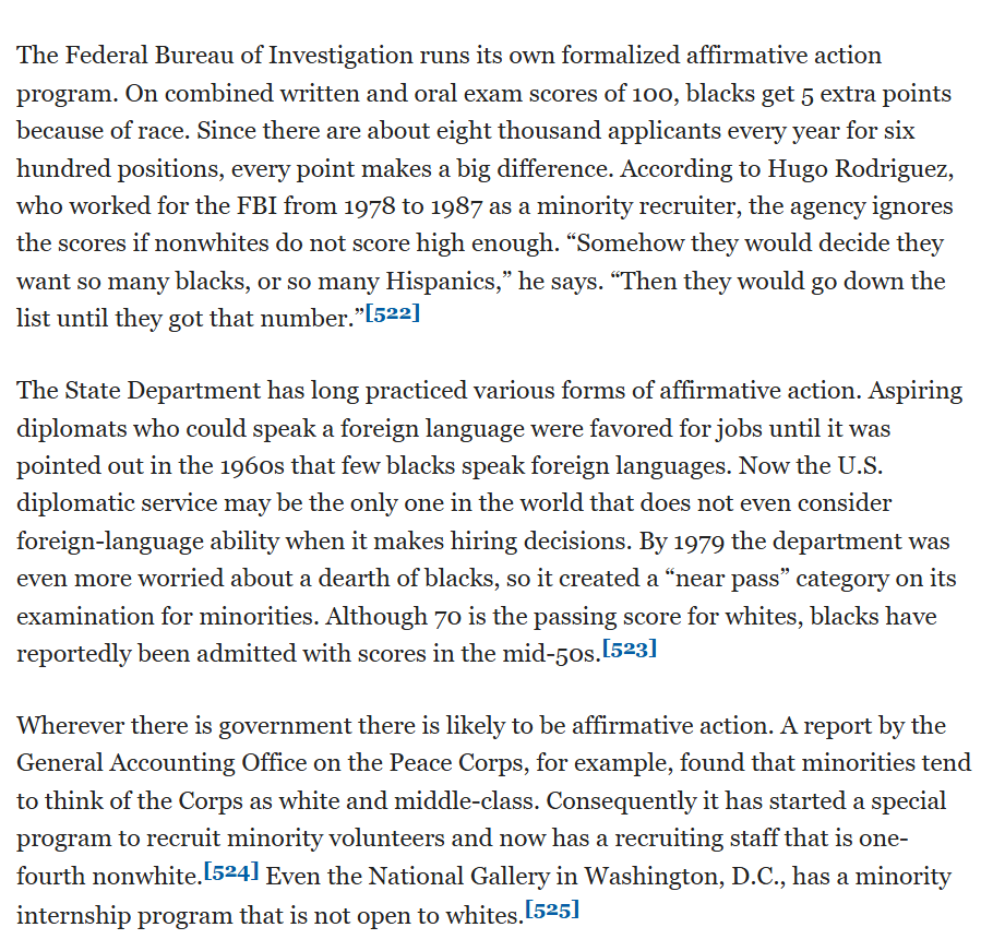 The FBI gives additional points on its hiring tests to nonwhites, and throws out the results if not enough nonwhites make it through anyways. State Department stopped considering foreign language skills because too few blacks spoke them and has a lower threshold for hiring them.