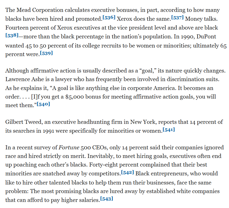 Only 14% of Fortune 500 CEOs in 1990 said they ignored race and hired exclusively on merit. Which makes sense, since so many companies tie bonuses to hiring fewer white men.