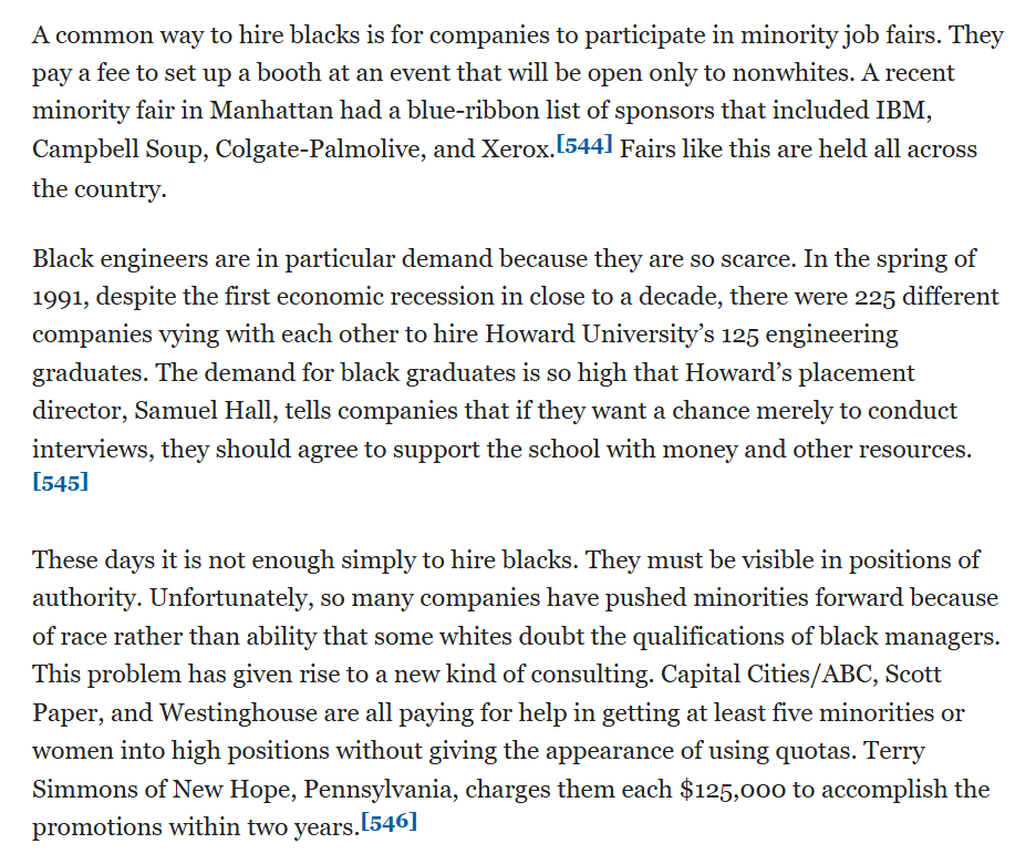 Minority-only job fairs are common. Black engineers are so in demand that Howard University began demanding donations to allow companies to recruit engineers there.
