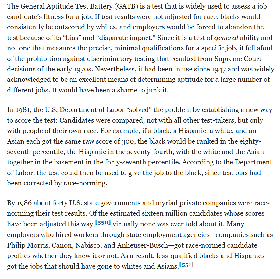 USG used to have a sophisticated psychometric test, the GATB, that they provided as a service to both govt agencies and private employers. But they race-normed results, so given an equal score the reported results would show black > Hispanic > Asian = white.