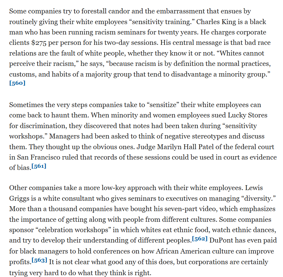 DEI training is not new. To diffuse white resentment of being discriminated against, companies gave "sensitivity" training to white employees. In one case, answers given when asked for negative stereotypes were used as evidence of bias later by Judge Patel in San Francisco.