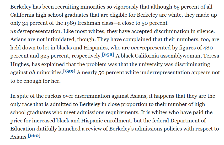 At Berkeley, both whites and Asians were discriminated against. However, Asians raised a stink and as a result were not underrepresented while whites were by a factor of two. Racial composition of admissions at selective schools is mostly determined politically.