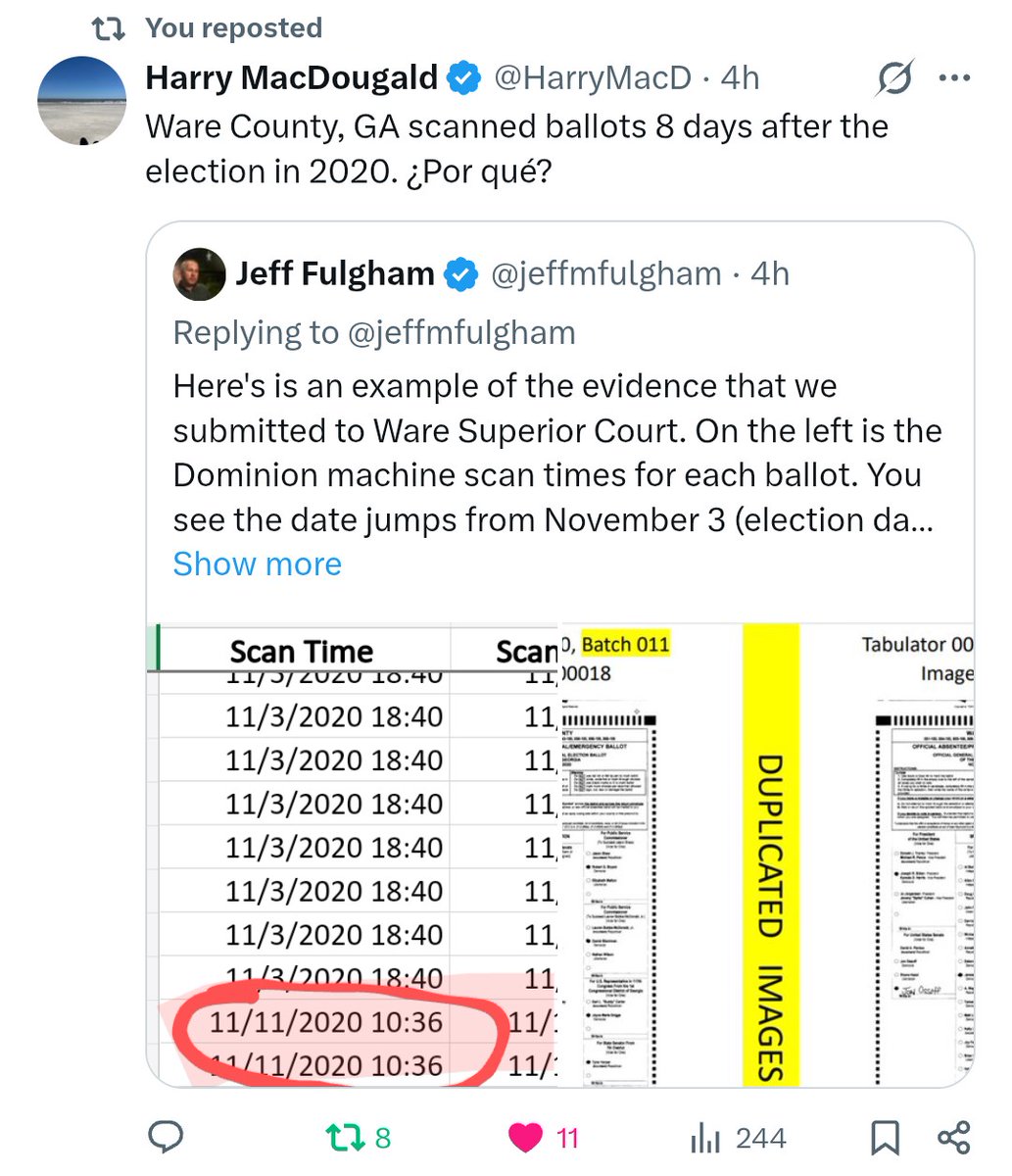 @mad_liberals, who successfully identified the double scanned ballots in Fulton County, discovered 8,110 across the state. Ware County had an interesting case. Their fake duplicate (double scanned) ballots were scanned (according to Dominion machine scan times) on November 11, 2020. But that was 5 days after Ware's certification meeting.