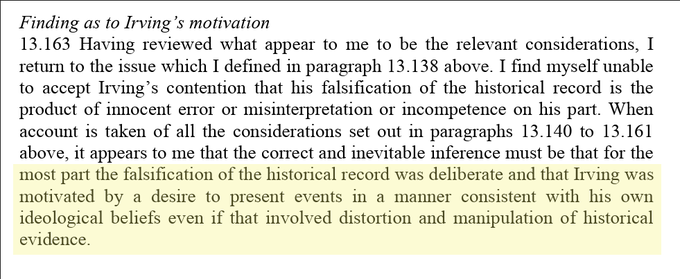 3. A bit on Irving: In one of the most famous court cases of the modern era, Irving was found to be a "deliberate" falsifier of history. (Entire opinion: ) drive.google.com/file/d/1P_vnFe…Image