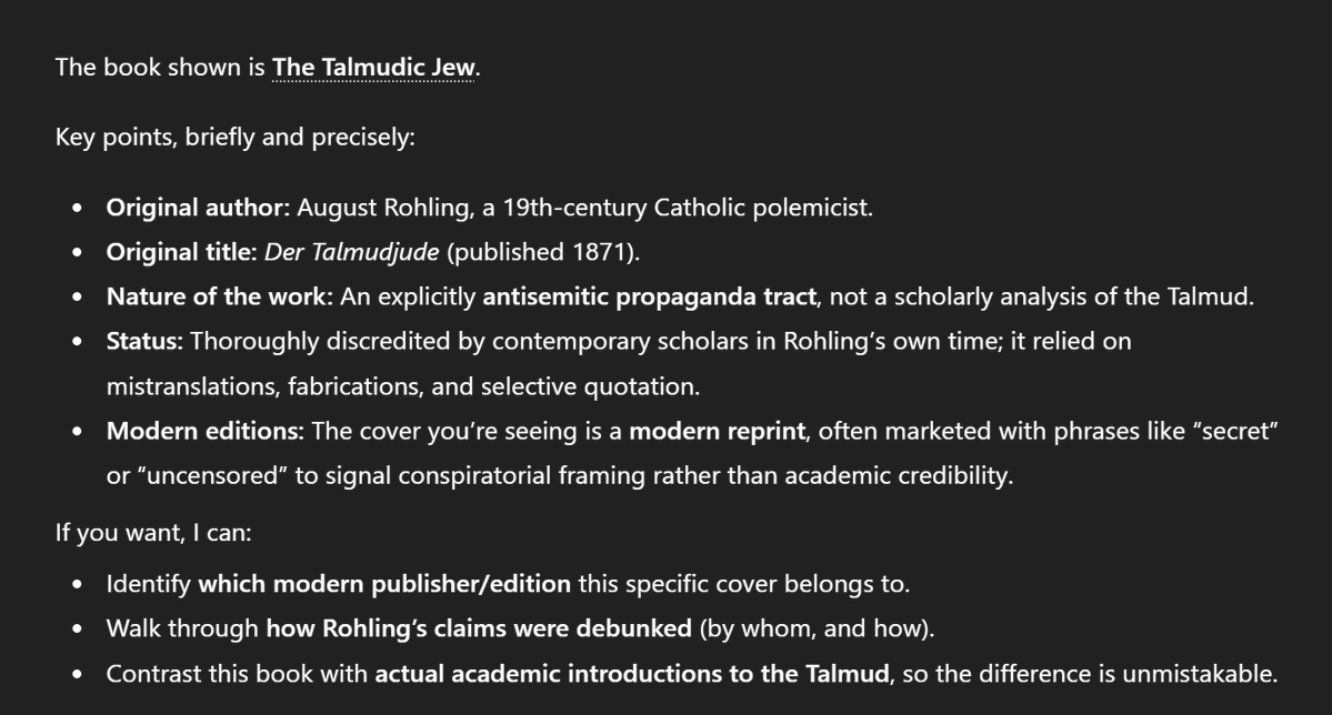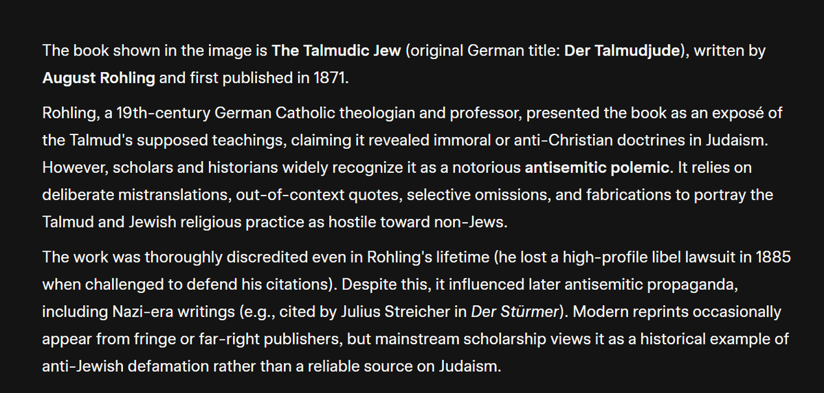 The book Candace holds up is VERY hard to find, but every AI immediately identifies it as a discredited source (embraced by the Nazis). Image