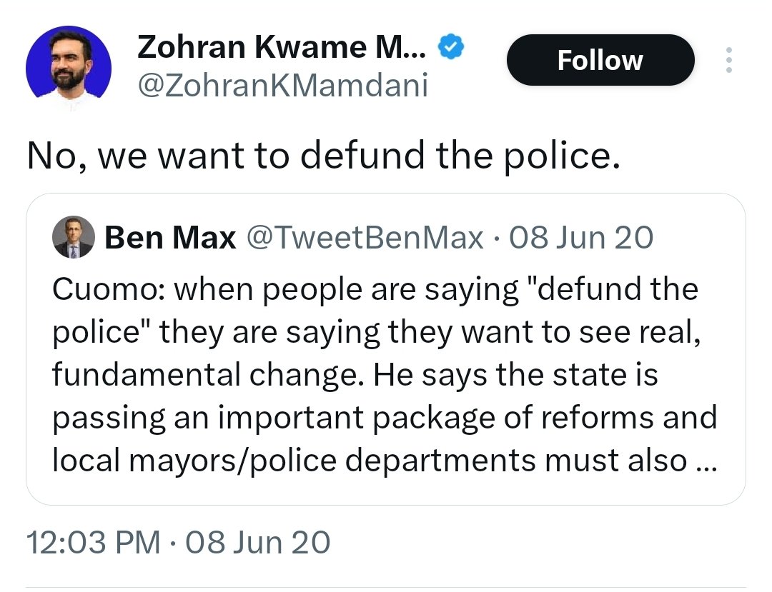 Zohran fervently advocated for defunding the police, an absurd and radical position, especially in one of the best-policed cities in America.