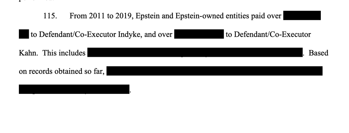 115. From 2011 to 2019, Epstein and Epstein-owned entities paid over $16 million net to Defendant/Co-Executor Indyke, and over $10 million net to Defendant/Co-Executor Kahn. This includes loans that are still outstanding to Indyke- and Kahn-related entities. Based on records obtained so far, tax forms provided by Epstein entities did not report nearly the full compensation to Indyke and Kahn.