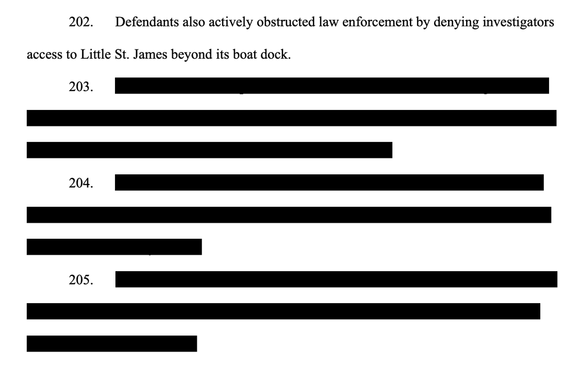 202. Defendants also actively obstructed law enforcement by denying investigators access to Little St. James beyond its boat dock. 203. Defendants also attempted to conceal their criminal sex trafficking and abuse conduct by paying large sums of money to participant-witnesses, including by paying for their attorneys’ fees and case costs in litigation related to this conduct. 204. Epstein also threatened harm to victims and helped release damaging stories about them to damage their credibility when they tried to go public with their stories of being trafficked and sexually abused. 205. Epstein also instructed one or more Epstein Enterprise participant-witnesses to destroy evidence relevant to ongoing court proceedings involving Defendants’ criminal sex trafficking and abuse conduct.