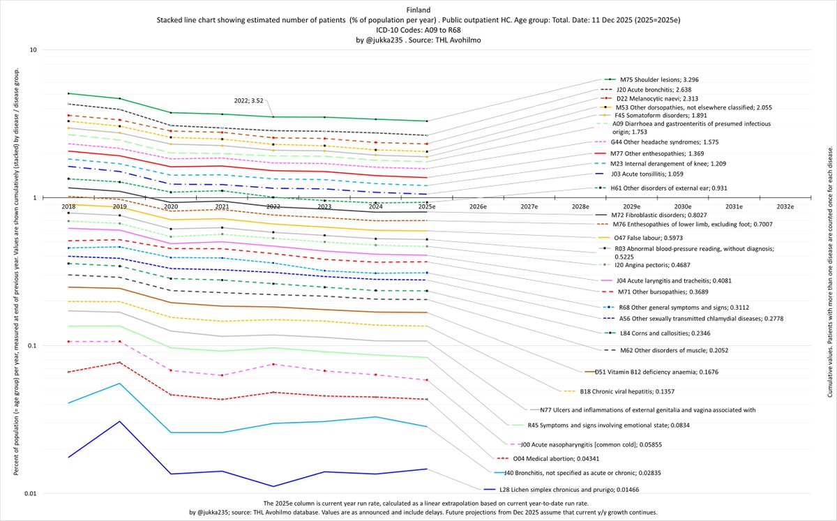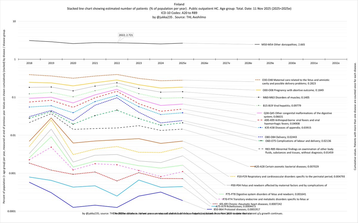 I have covered the top level disease groups (called chapters) from A to R. These divide into 1393 disease categories reported by THL (and me) and further into approx. 10500 individual diseases or conditions (not reported). (I call disease categories "diseases".) 9/x