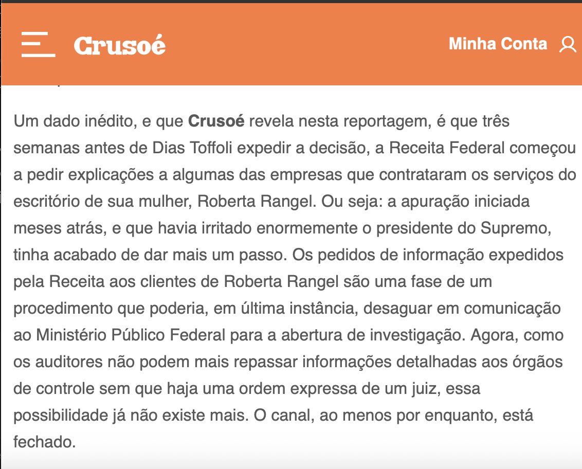Segundo movimento: três semanas depois, Dias Toffoli decidiu, monocraticamente, que a Receita não poderia enviar informações ao Ministério Público sem prévia autorização judicial. O canal para investigação criminal estava fechado.