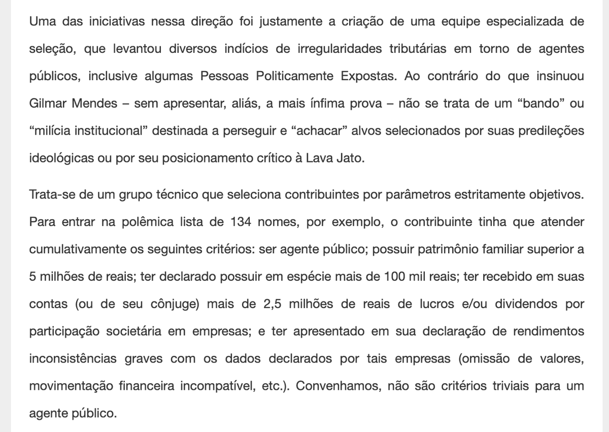 Em sua justificativa técnica, um auditor escreveu que os dados mostravam "focos de corrupção, lavagem de dinheiro, ocultação de patrimônio ou tráfico de influência" do ministro Gilmar Mendes e de sua mulher.