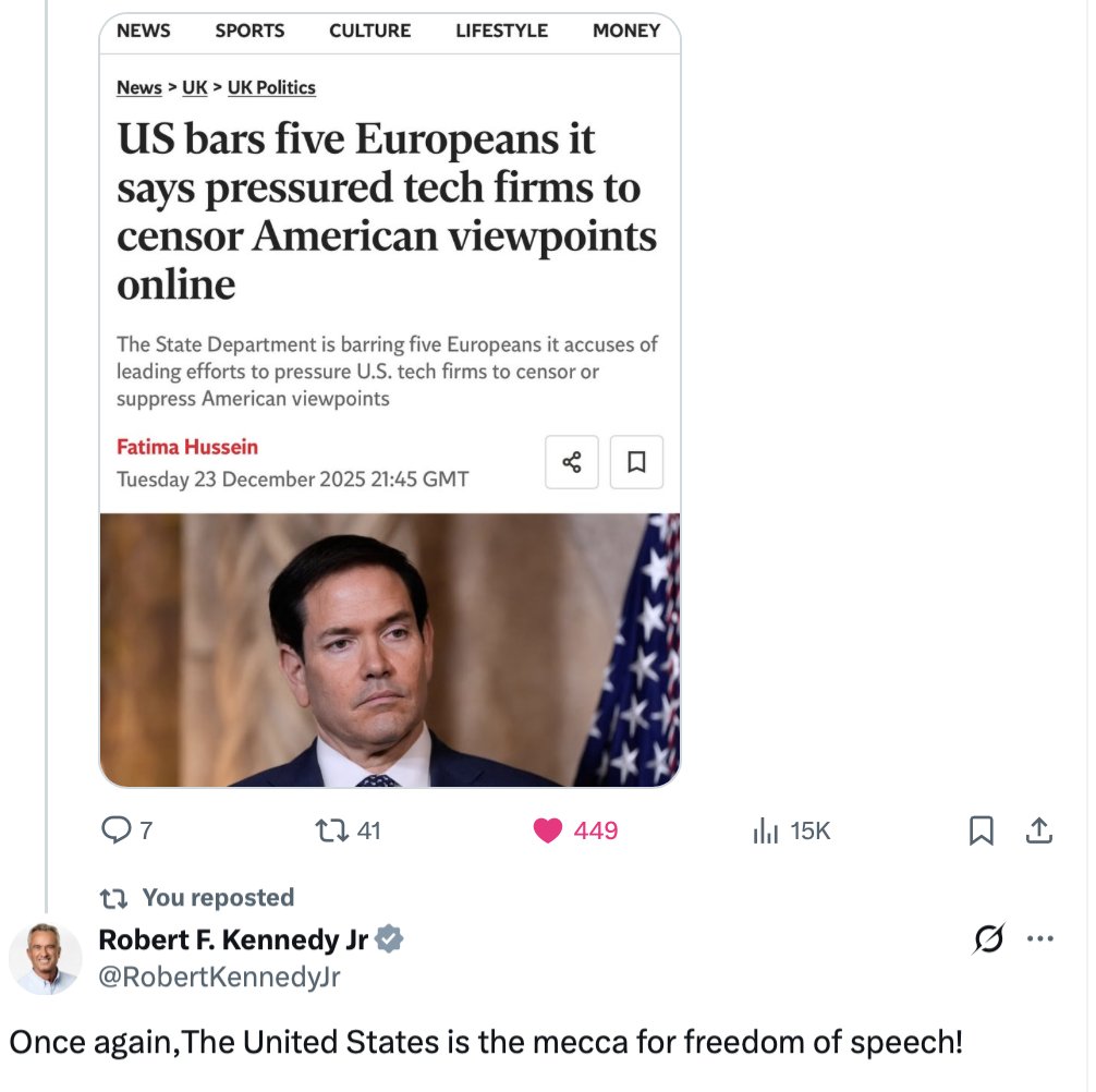 Secretary @SecRubio announced action against "the global censorship-industrial complex."