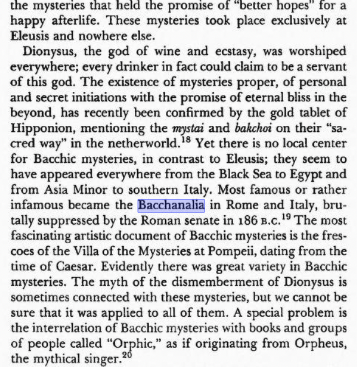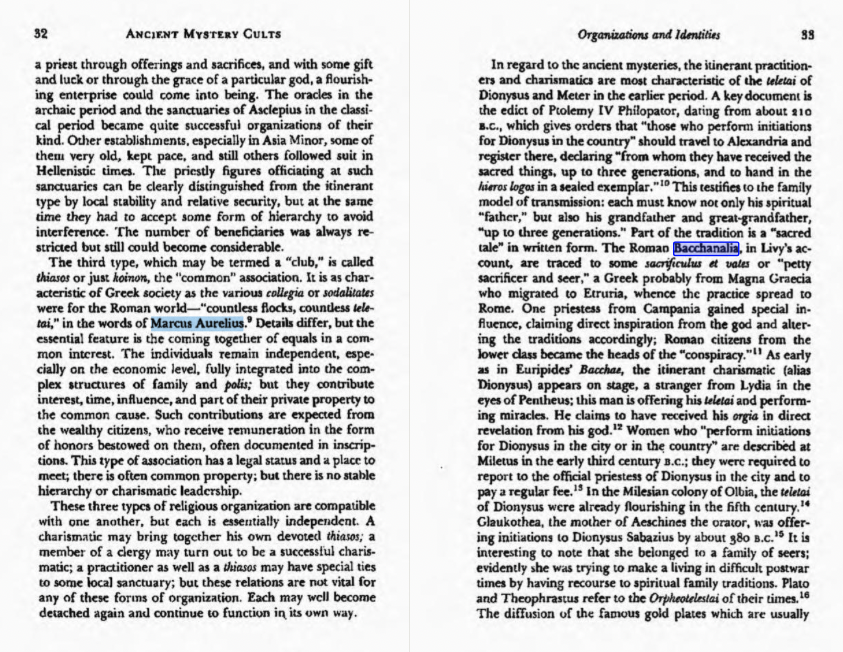 Walter Burkert's book goes into details about Bacchus and the Cult of Baccanalia and their traditions, but a shorter way to describe how they infused themselves into Roman culture (kinda) is this tiktok video I archived a few years ago:
