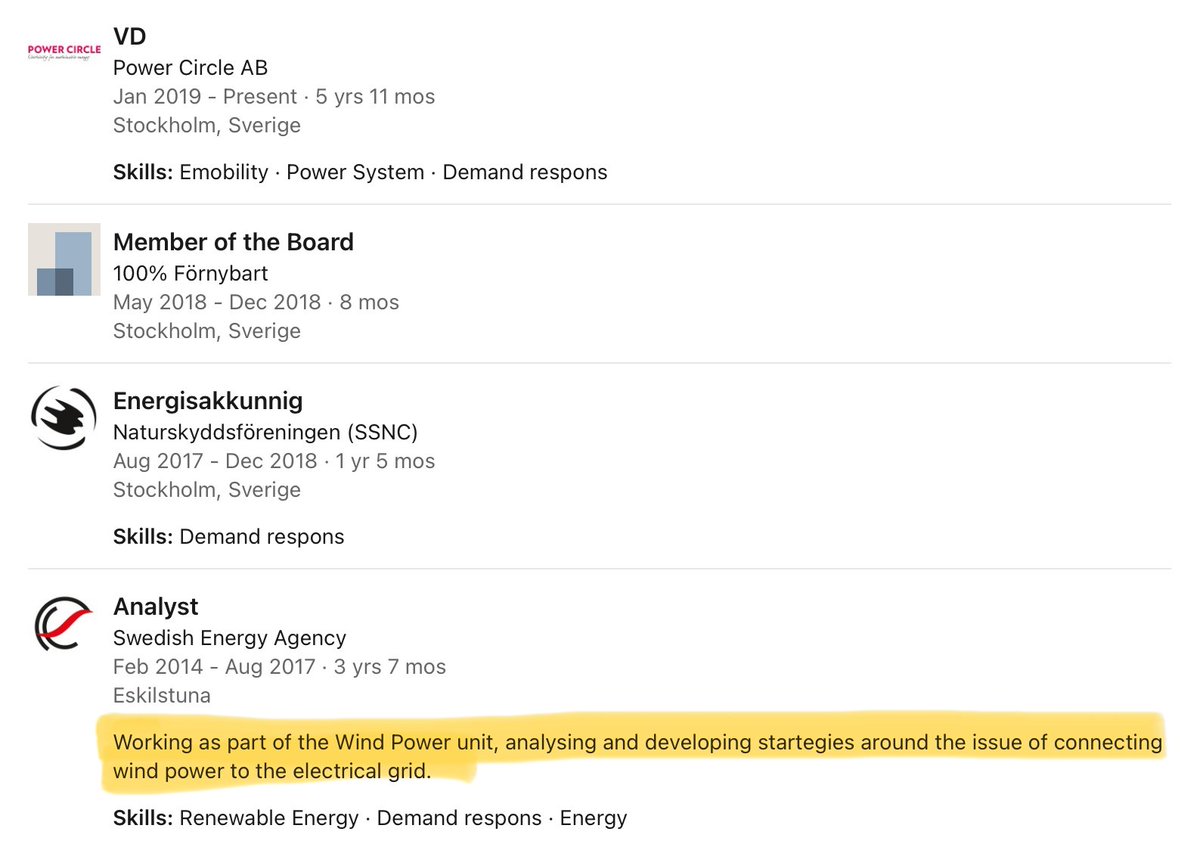 … men under perioden 2014-2017 var hon handläggare på @Energi_mynd. Här fokuserade hon på vindkraftsfrågor.