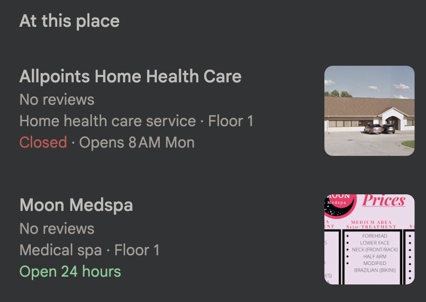 Let's do some spot check-ins while waiting for the run to finish. Here's the very first hit, Satti Home Health Care. What's actually there: a nail salon.