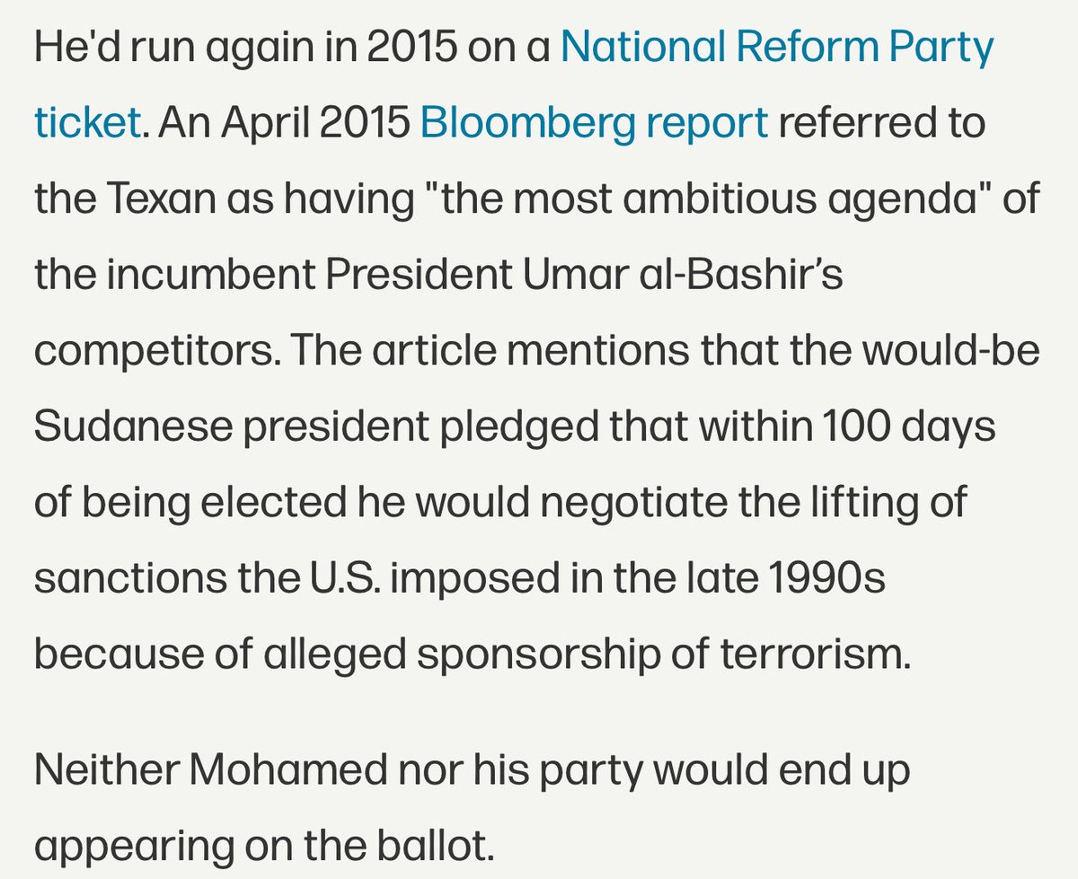 He told his constituents that, if elected, in his first 100 days, he would travel to the Obama WH to have all sanctions on Sudan lifted.