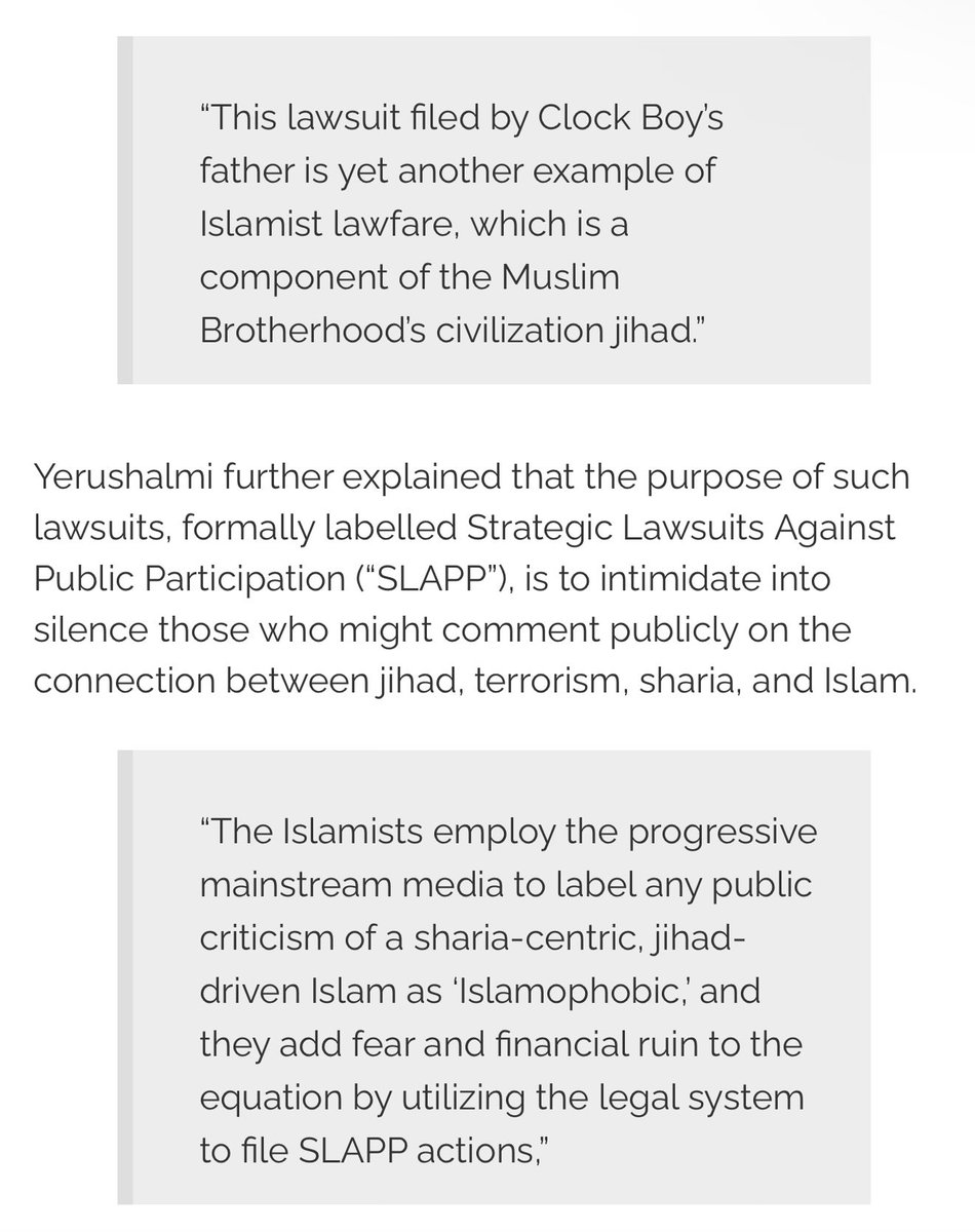"Jim Hanson, a CSP senior vice president, a former member of the U.S. Army Special Forces, and an expert on counter-terrorism, was sued along with CSP and the other media defendants for suggesting that the entire affair was a PR stunt by Clock Boy’s father in order to generate a media firestorm about anti-Islamic bias and Muslim-victimization."
