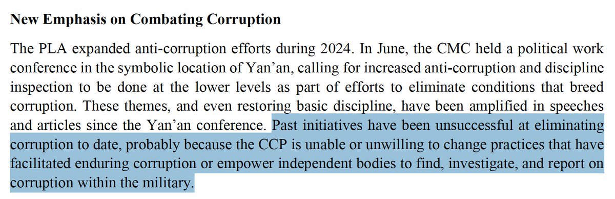 Regarding the PRC's anticorruption purges, the report assesses (as I have) that while there are likely to be short-term impacts to PLA readiness, in the long term it's probably going to be a good for the force's military effectiveness.