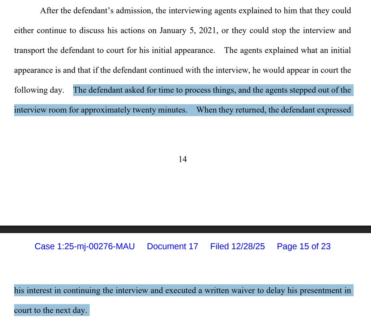 After 20 min of consideration, he "expressed his interest in continuing the interview and executed a written waiver to delay his presentment in court to the next day."