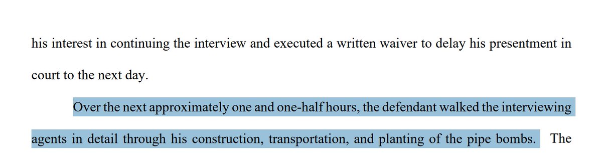 - "Over the next approximately one and one-half hours, the defendant walked the interviewing agents in detail through his construction, transportation, and planting of the pipe bombs."