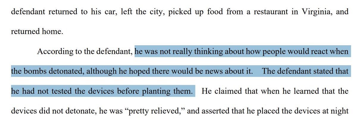"He claimed that when he learned that the devices did not detonate, he was “pretty relieved,” and asserted that he placed the devices at night because he did not want to kill people."