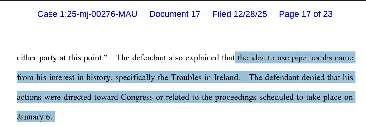 Cole Jr stated that "the idea to use pipe bombs came from his interest in history, specifically the Troubles in Ireland. The defendant denied that his actions were directed toward Congress or related to the proceedings scheduled to take place on January 6."