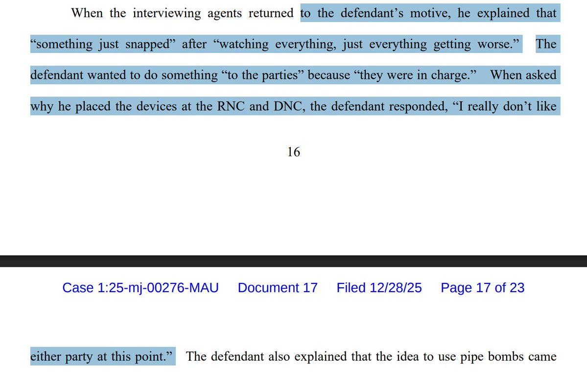 - Motive: "he explained that 'something just snapped' after 'watching everything, just everything getting worse.' The defendant wanted to do something 'to the parties' because 'they were in charge.' 'I really don’t like either party at this point.'"