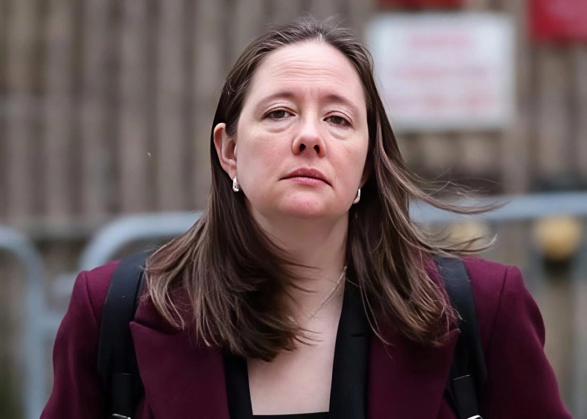 She’s wearing a navy blazer. Her hair is pulled back. She speaks confidently.