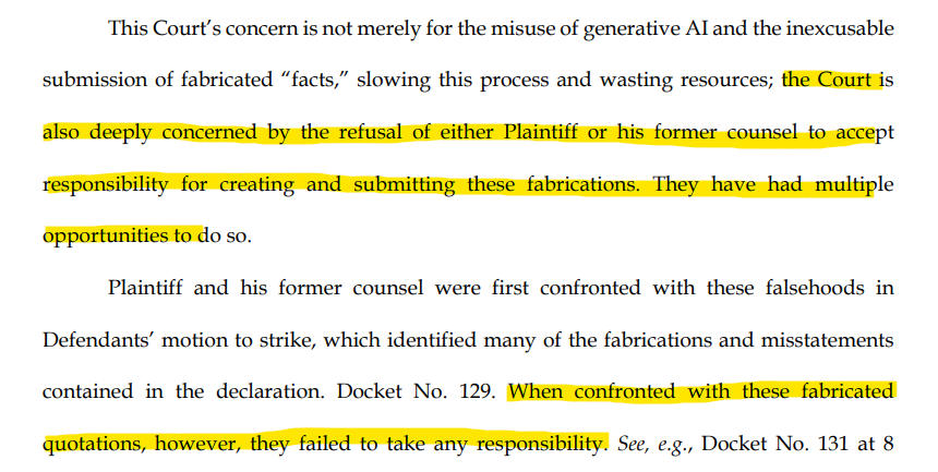 When "confronted with these falsehoods," the lawyer refused "to accept responsibility for creating and submitting these fabrications."
