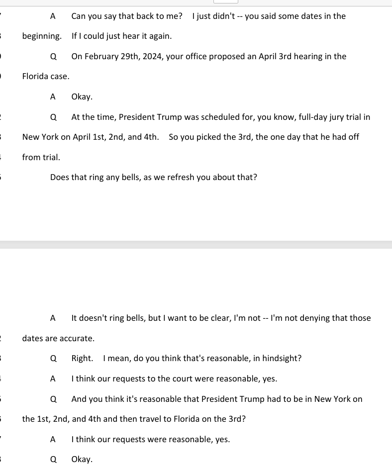 Not really a lie but definitely a misrepresentation of Smith's push to schedule proceedings very quickly and in an unreasonable manner given the president's other court obligations.