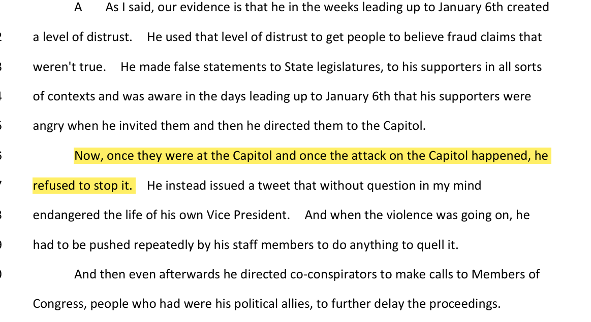 Trump did not have to be "pushed" by staff to denounce the escalating chaos--this is a lie pushed by Liz Cheney and others here repeated by Jack Smith--that the president delayed saying anything to stop his supporters from doing anything bad.