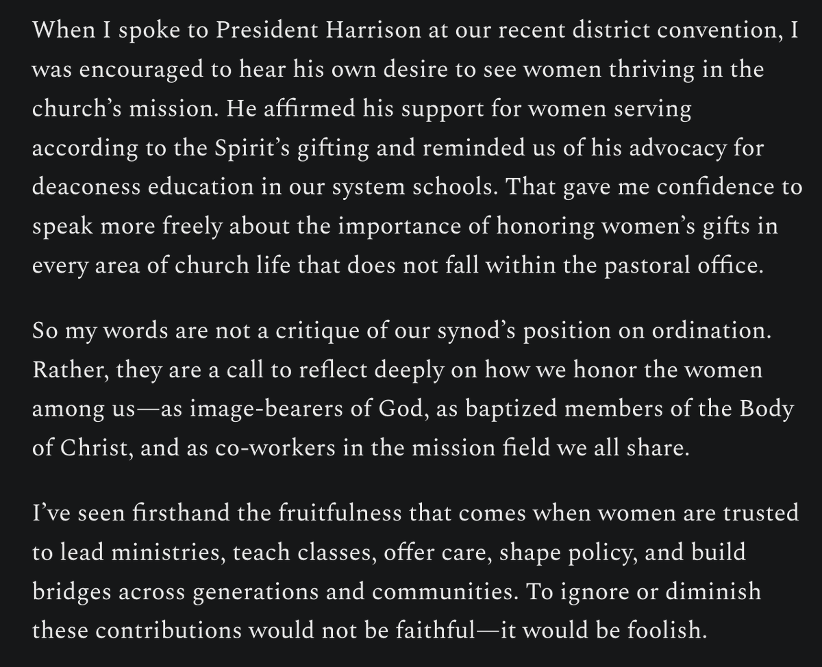 Right before Pastor Holt released his articles, Harrison was declaring at the Southern District Convention that "the Missouri Synod is never going to give up women's suffrage, nor should we."