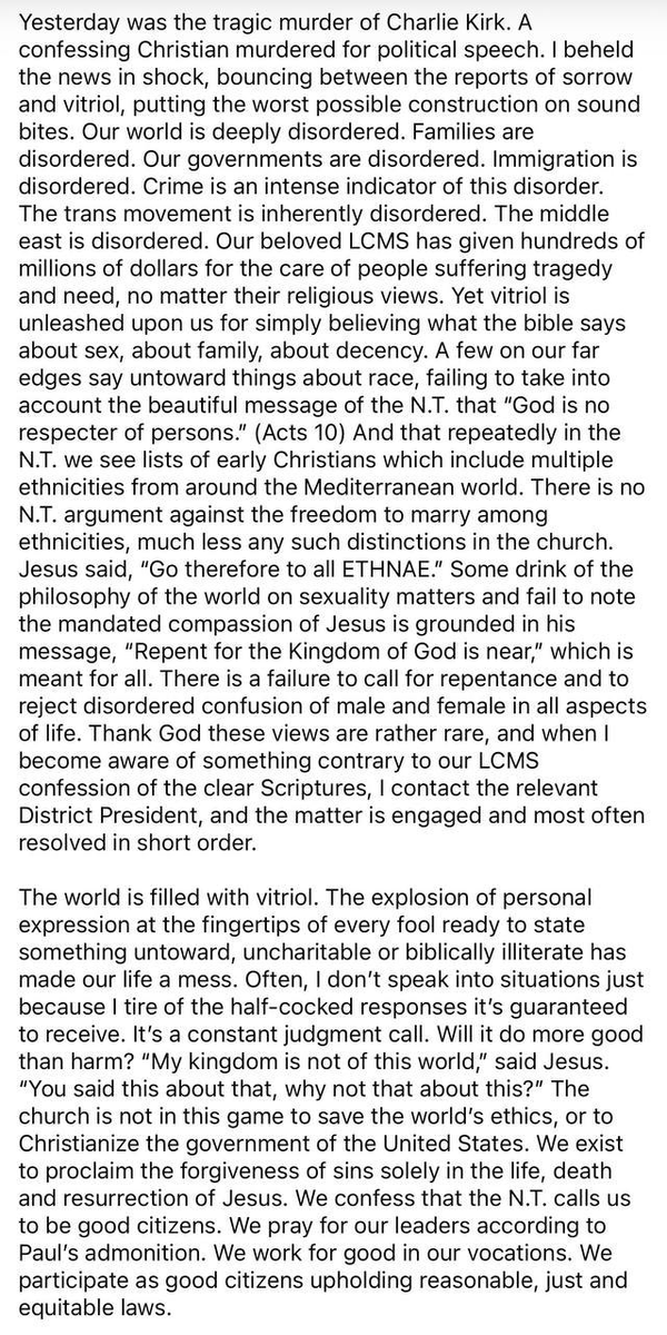 As outrage over Zarutska’s murder reached a boiling point, Charlie Kirk was shot in front of his family. Immediately, Lutheran workshop Ad Crucem posted a Christian Nationalist rallying cry that was poorly received by the pastorate.