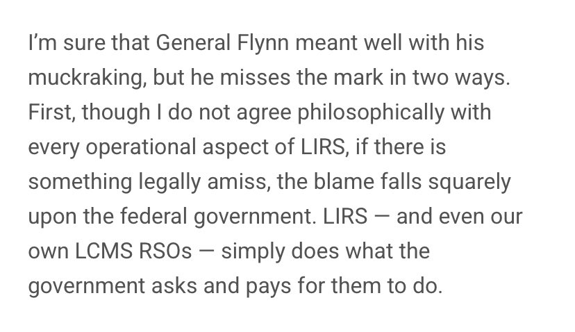 In response to the newfound public pressure, LCMS President Matthew Harrison responded that the LCMS no longer funded Lutheran Immigration and Refugee Services, and that the affiliated NGOs were just doing what the government told them to do.