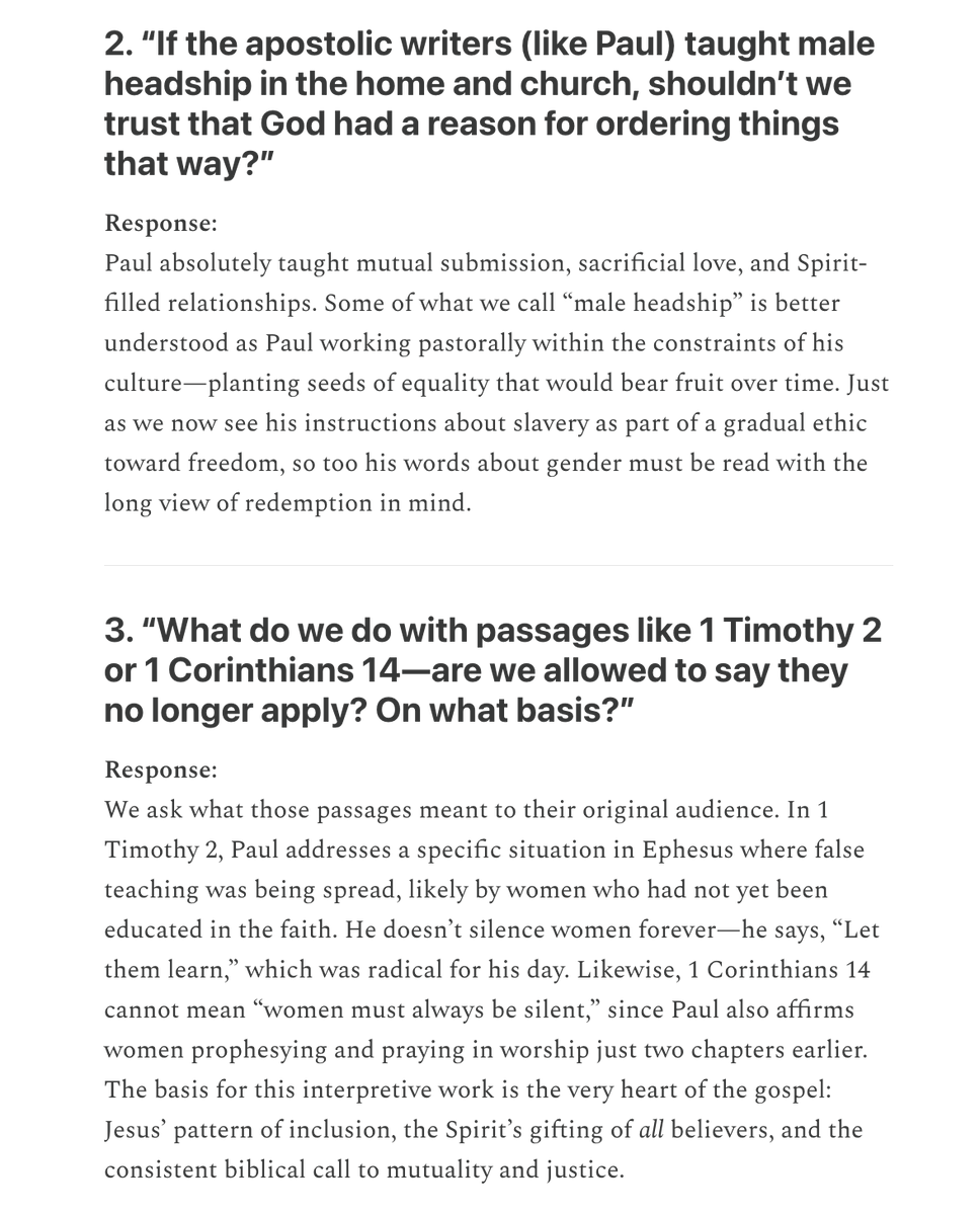 Two days later, Pastor Holt clarified his positions, stating that he was not trying to change doctrines and was only motivated by President Harrison's work and words on women's leadership in the church.