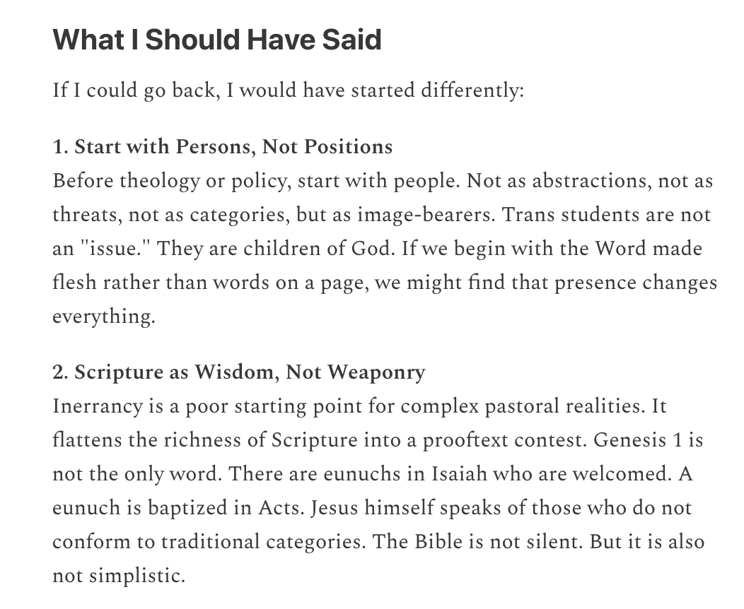 On April 1st, Pastor Holt released an article on transgender students and Christians, specifically on why they should be tolerated more. Further, the Bible is not the starting place for dealing with this, though it allegedly supports his beliefs.