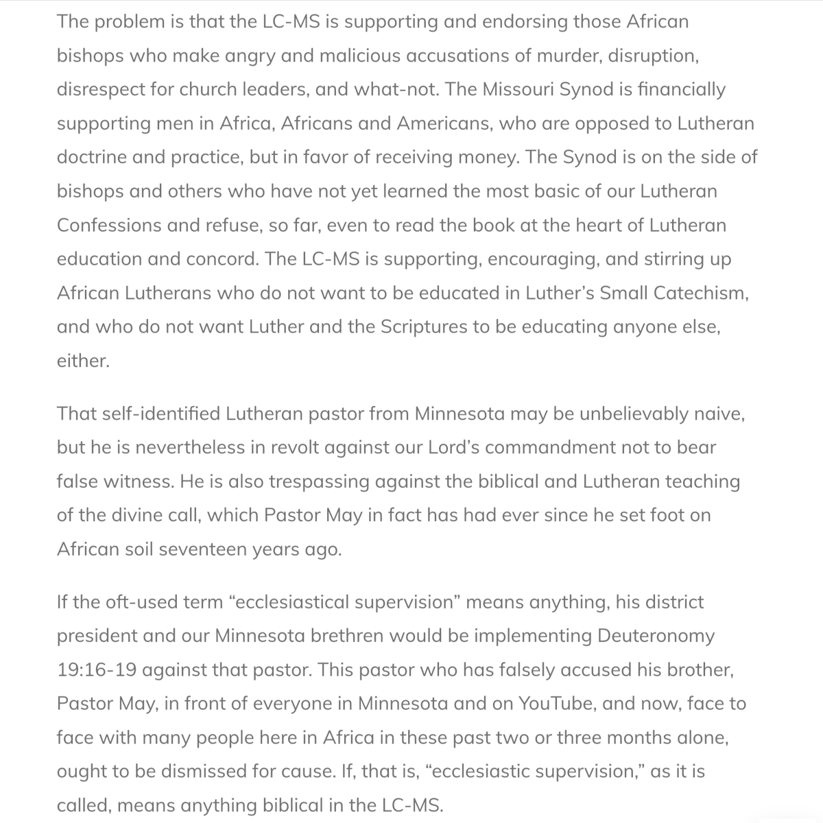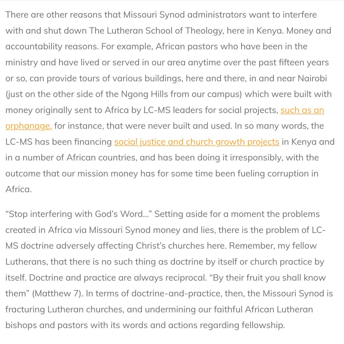 Later in September, Dean of the Lutheran School of Theology in Kenya Dr. Schulz published a Kenyan pastor's plea to the LCMS: "Leave us to our poverty, and stop interfering with God's Word in Africa and our Lutheran Seminary in Kenya!"