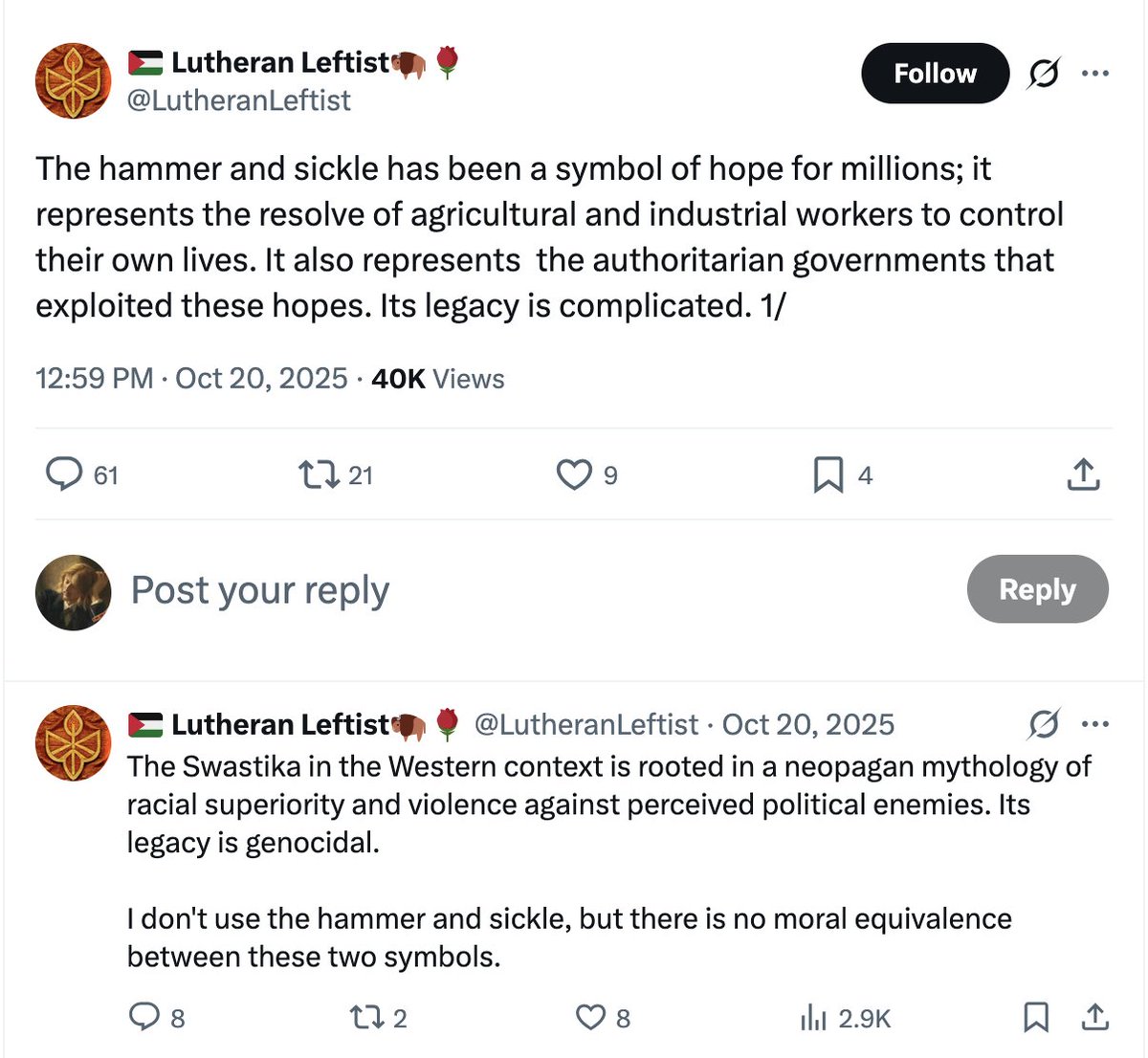 The same day, an LCMS congregant under the alias "Lutheran Leftist" declared "The hammer and sickle has been a symbol of hope for millions... Its legacy is complicated." Though the swastika is completely unconscionable.