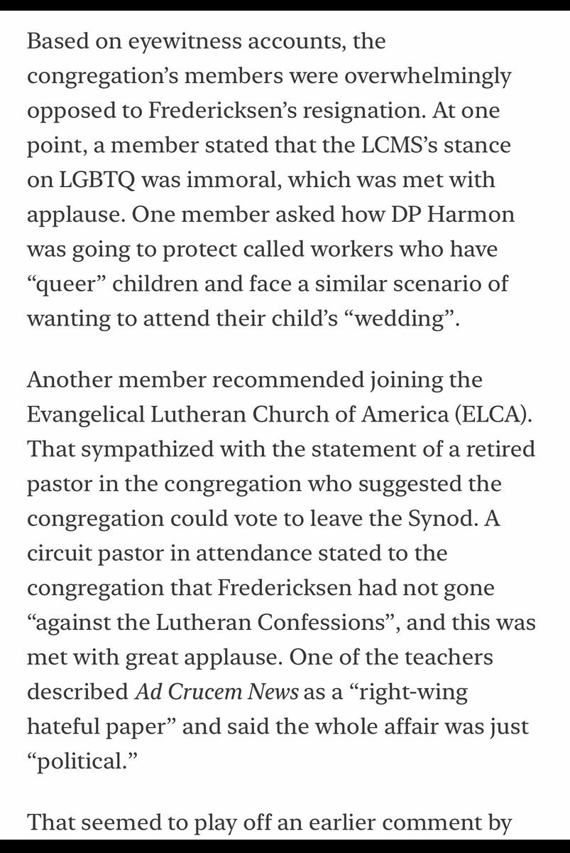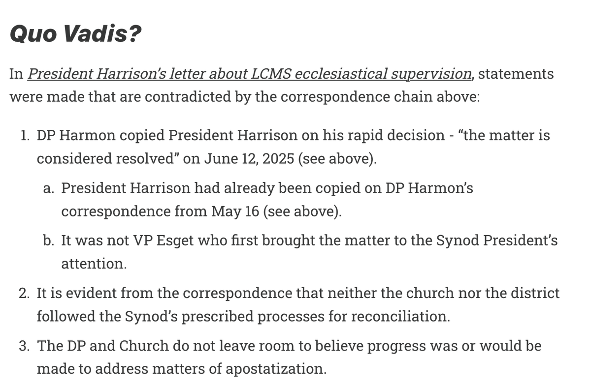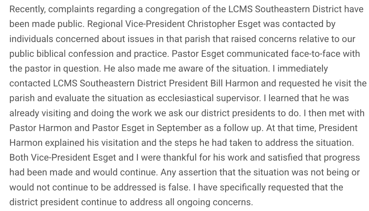 Soon after, Ad Crucem released information on the pastor with the trans stole which contradicted President Harrison's statement. Specifically, Harrison and the synod knew about what was happening at that church and tried to brush it under the rug.