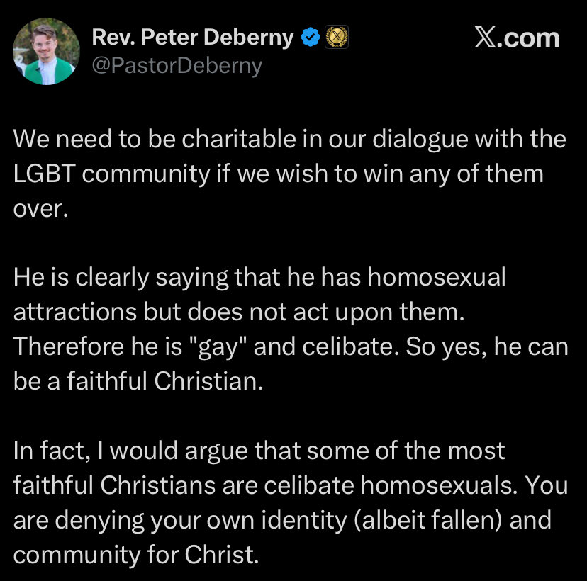 A day later, Pastor Deberny exhorted Christians to be more charitable and tolerant "in our dialogue with the LGBT community." He further said that the most faithful Christians he knows are celibate homosexuals.