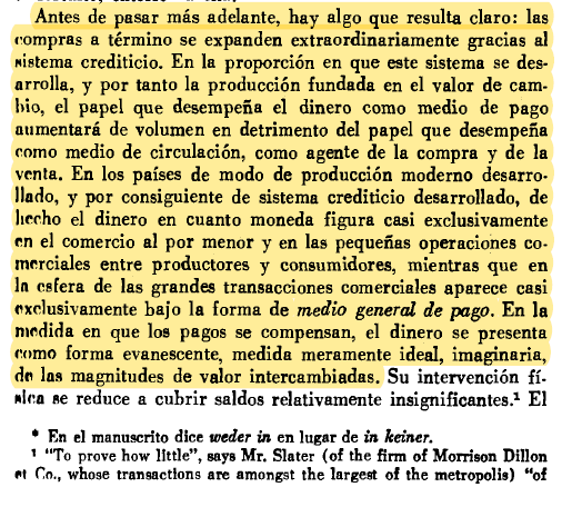 Aun con su advertencia, Marx desgrana el dinero bancario a través de la función de medio de pago, en tanto y cuanto, con el desarrollo del sistema crediticio, las grandes transacciones se realizan a crédito; i.e, se emiten letras de cambio que podrán descontarse.